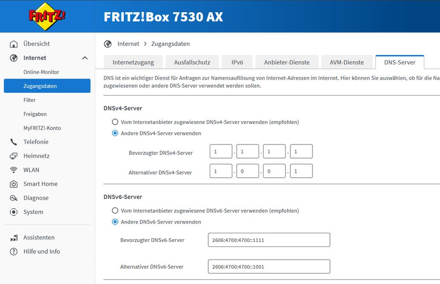 Alternativer DNSv6-Server: 2606:4700:4700::1001