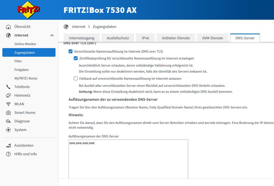 Mit DoT verschlüsselt die FRITZ!Box ihre DNS-Anfragen zum Resolver. Dadurch wird Manipulation erschwert und der Schutz robuster – auch gegen Mitschneiden durch Dritte. Die FRITZ!Box erwartet dabei Hostnamen der Resolver.